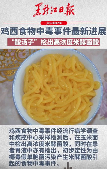 根据黑龙江省卫生健康委员会发布的最新信息,鸡西食物中毒事件经流行病学调查和疾控中心采样检测后,在玉米面中检出高浓度米酵菌酸,同时在患者胃液中亦有检出,初步定性为由椰毒假单胞菌污染产生米酵菌酸引起的食物中毒事件。否定了此前酸汤子致使多人中毒的疑似物质黄曲霉素。