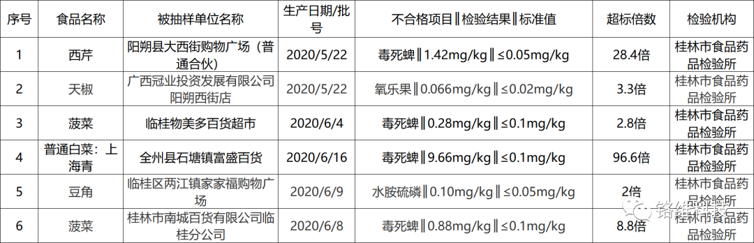 不仅不新鲜的食物会引起中毒,农药超标的蔬菜同样会引起中毒。前不久,广西桂林市市场监督管理局官网发布了2020年第7号食品安全监督抽检信息通告。通告中有6批次蔬菜农药残留超标,其中,上海青农药残留超标96.6倍,吃进这种高毒农药残留严重超标的蔬菜,绝对会出现农药中毒症状。